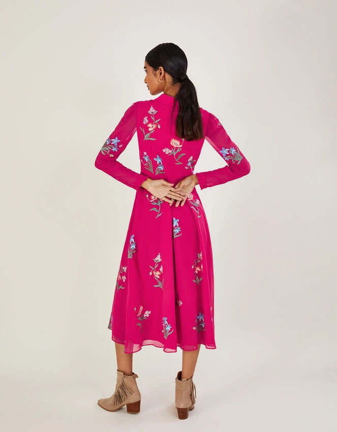 Keep it bohemian with Mara, with flower embroidery on a fuchsia backdrop. She features a pretty frill detail that cascades down the button fastening, perfect for the office and dinner dates.