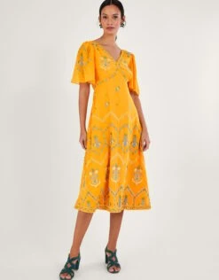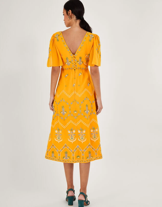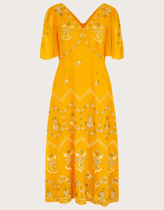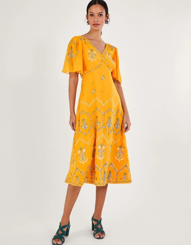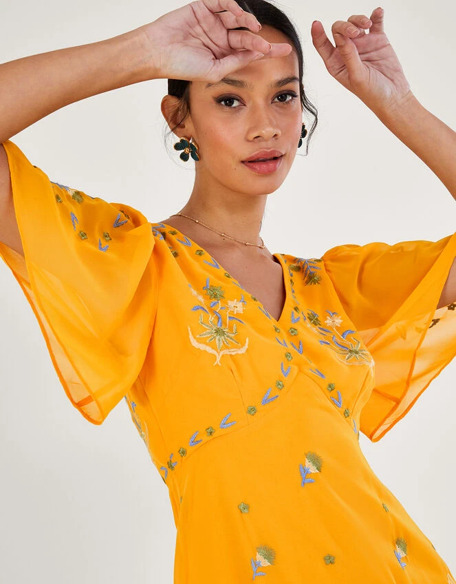 Watch Margo’s gentle floral embroidery travel through this dress, from the angel sleeves down to the midi length skirt. She’s cut in a classic tea dress silhouette, with a sunny yellow backdrop, crafting the perfect piece for summer occasions.