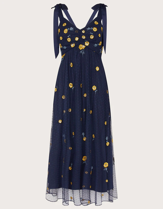 Pretty petals decorate Marisa, perfect for summer occasions. She’s light and dainty, with a spotty mesh overlay, and tie detail shoulders that fall delicately down the arms. Her sunny floral embroidery pops against the navy backdrop, making her a standout piece. Blue