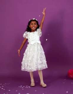 For the most special of occasions: slip little ones into our Mary-Kate dress and their comfiest pair of party shoes for hours of dancing in the afternoon. Designed in ivory fabric with a tulle overlay, it features foiled florals alongside 3D butterflies – creating an ethereal finish. Complete with a glossy ribbon to define the waist and a zip fastening on the reverse. Ivory