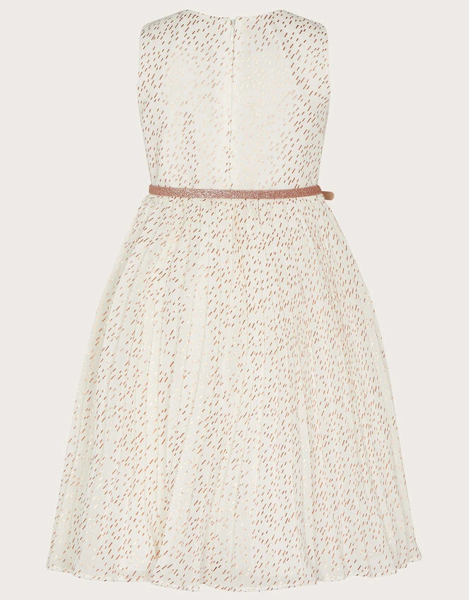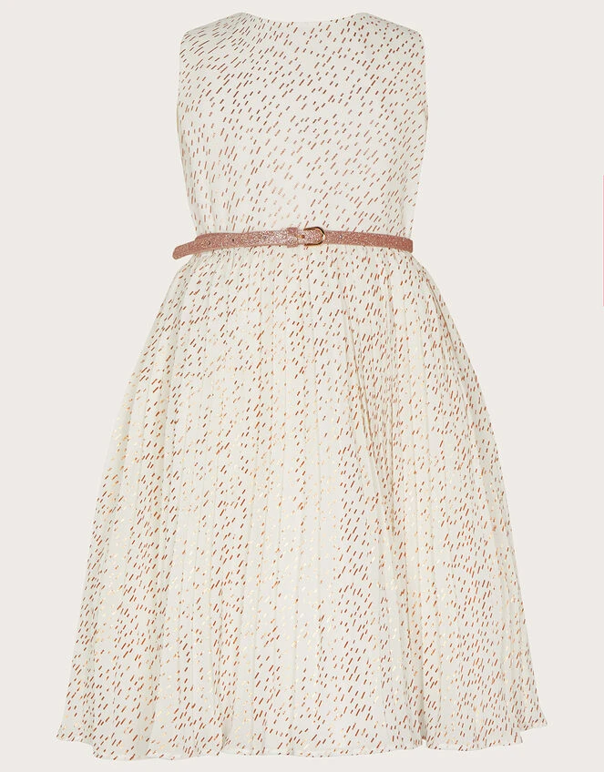 Perfect for partying, this sweet dress is decorated with flashes of rose gold for a pretty touch that’ll shine under the party lights. The skirt is entirely pleated, with a sleeveless bodice and sparkly rose gold belt that ensures a snug fit. Ivory