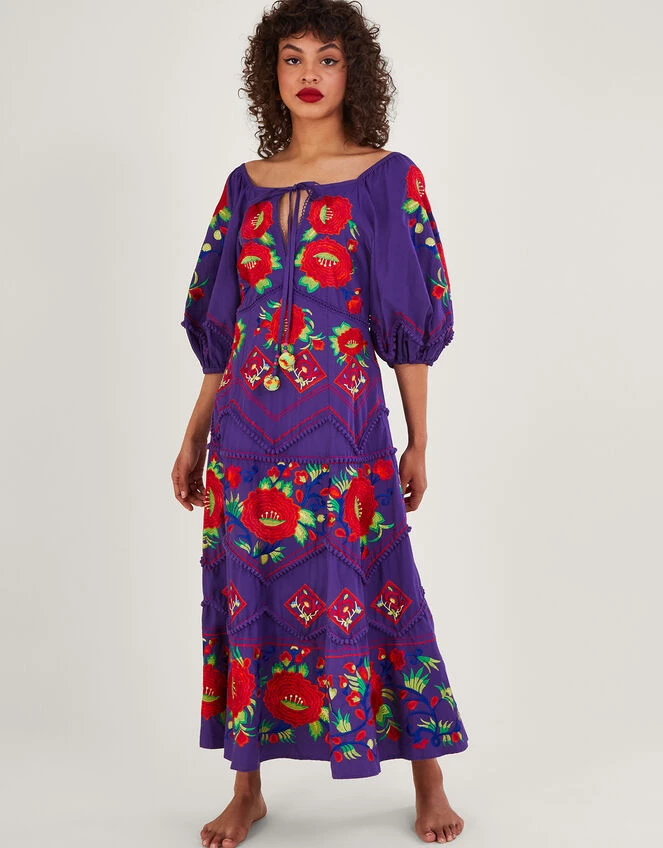 Pretty-in-purple, Meryl’s vibrant casting is sure to have you standing out amongst the leafy green alfresco backdrop. Her Bardot neckline boasts a tassel fastening, adding a delicate and feminine touch, falling into a maxi-length skirt that’s sure to dance in the spring and summer breeze. She’s doused in blooming red florals, with vibrant green foliage and embroidered trims through the skirt.