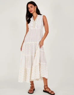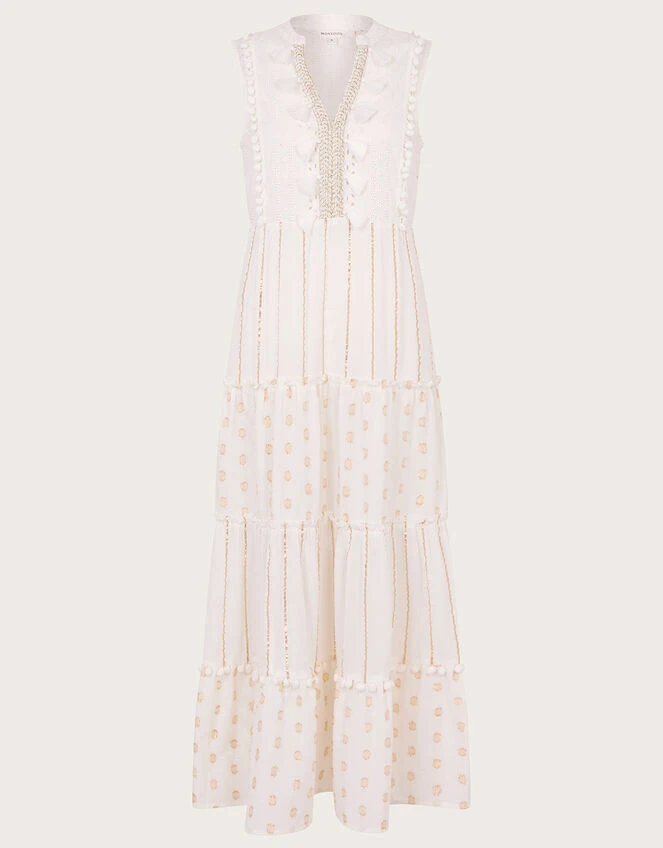 Full to the brim with detail, this dress features a sleeveless bodice with pom-pom, tassel, and gold metallic embroidery to the centre. The tiered maxi skirt is embroidered with spot and stripe contrast detailing that’ll flow in the summer breeze.