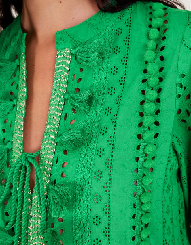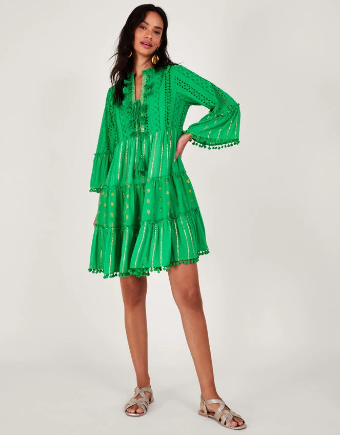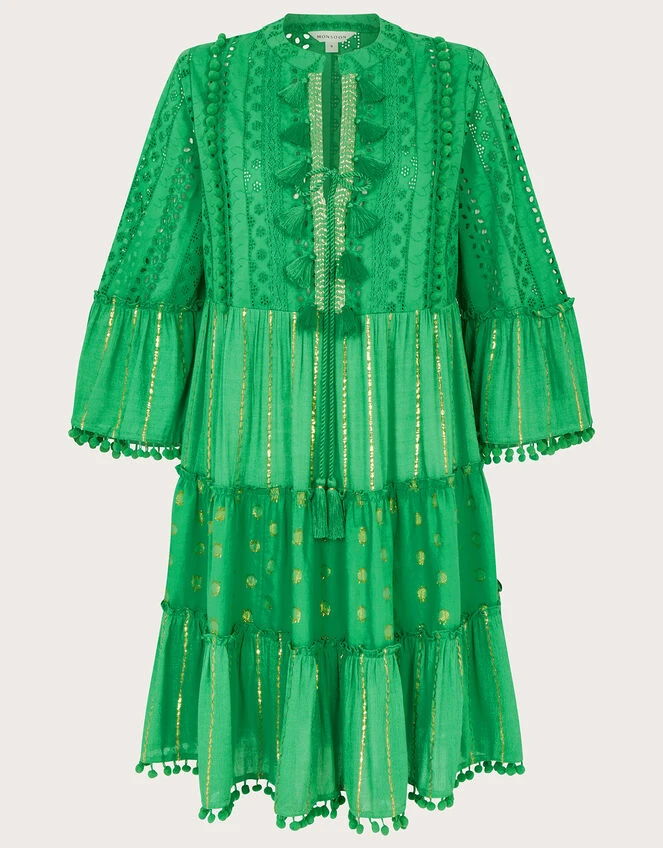 This kaftan dress is full of detail, from the tassel neckline to the pom-pom trims. It features a relaxed fit for a breezy finish, with a tiered skirt and gold metallic accents throughout. Green