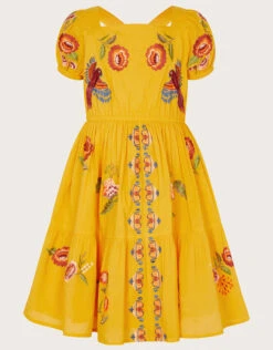 You’ll never lose little ones in crowded garden parties and family soirees with this dress on. Immersed in a vibrant yellow hue that’s topped with traditional embroidery, the profile is tiered for a floaty finish. Built with puff sleeves and a crossover back, style it with sandals for easy occasion dressing.