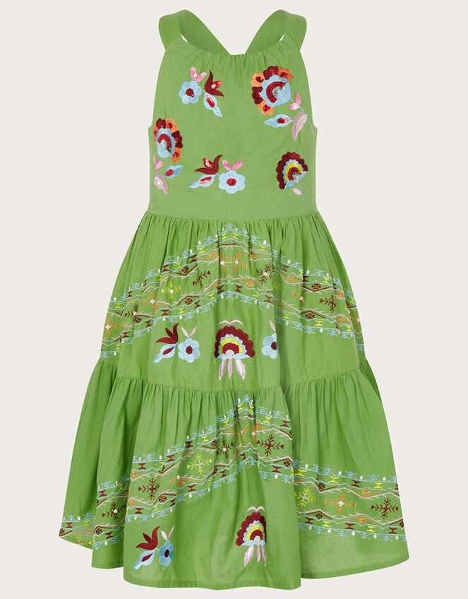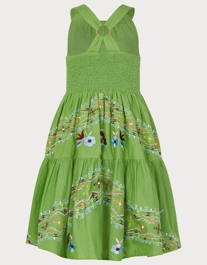 Helping define each layer of the tiered profile, this piece showcases traditional embroidery over a true green backdrop. Sitting relaxed around the neck, the straps meet at the back with a ring detail alongside a stretchy shirred panel for comfort. Style with heeled sandals and a cardigan layered over the top for the finished party look.