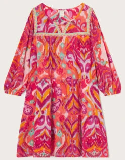 Bright and beautiful tones adorn this dress in a bohemian ikat print, perfect for breezy spring and summer days. It’s cut in a smock profile, hanging in a relaxed fashion, with gentle tiering to the skirt and a keyhole neckline with embroidered tracking to the bib.