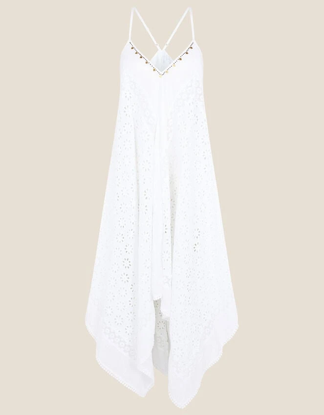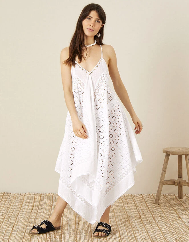 For your next beach day: Miquel combines feminine broderie lace with a crisp white hue. The adjustable straps ensure a comfortable fit, whilst the handkerchief hem infuses the piece with bohemian spirit.