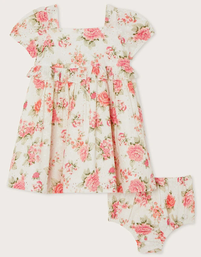 Roses bloom over this dress for newborns, designed with breezy broderie stitching. Built with puff sleeves and a square neck, it’s finished with a frill detail to define the waist and matching briefs to style underneath.