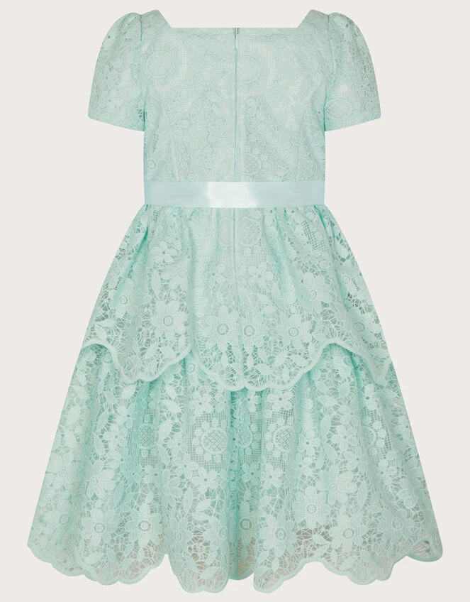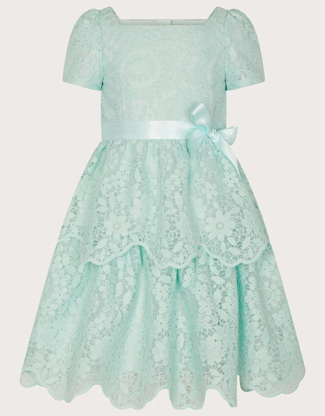 Designed in a fresh mint hue, this pretty piece was made for spring and summer events. The delicate lace overlay adds a sweet touch, with a tiered, slightly puffed skirt and a satin bow to the waist. Fastens with a zip on the reverse. Green