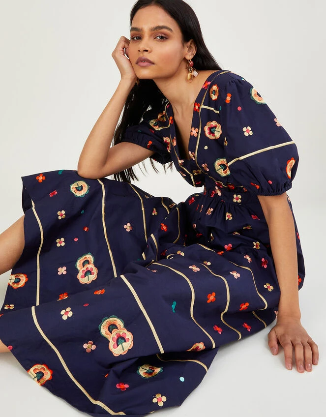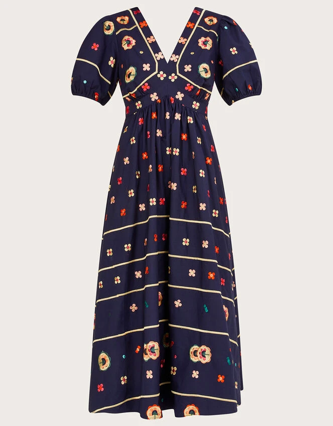 Ola’s a wardrobe winner, with her scandi-inspired colour palette and embroidered florals. She hems at midi length, with a fitted bodice and puff sleeves to balance out the voluminous fall. Fully lined for comfort.
