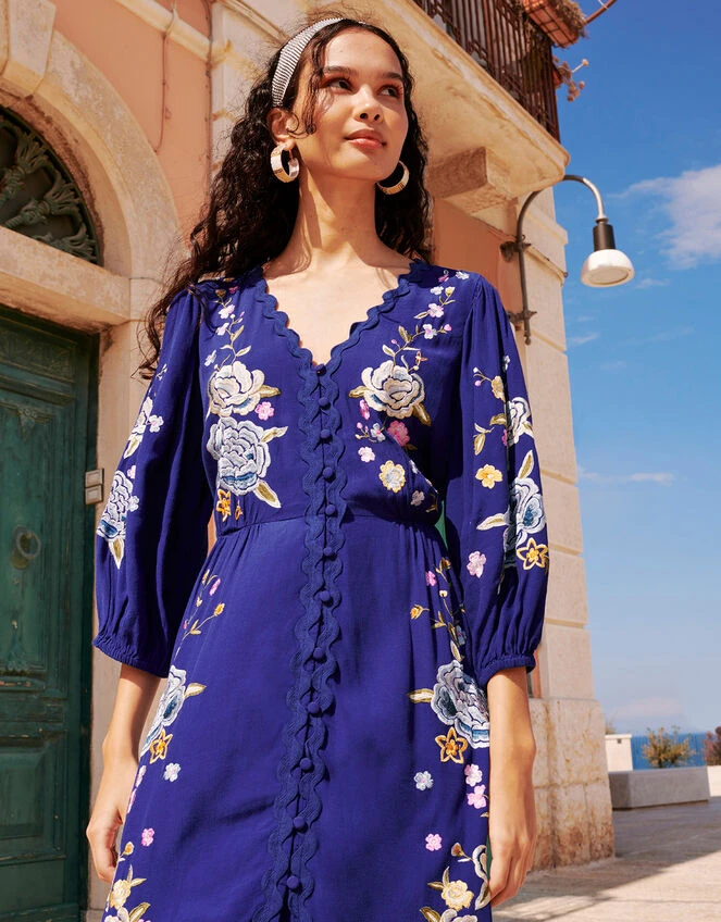 Splashed with a cobalt blue casting, Olla’s timeless tea silhouette ensures a feminine finish on your party look. Her floral embroidery cascades from the shoulders, down the bodice and to the midi length skirt. Take a closer look and see her ricrac embroidery on the neckline for a textural finish.
