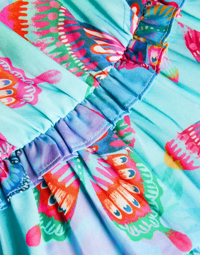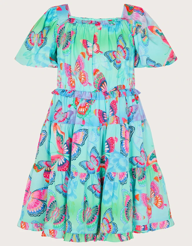 Kaleidoscopic butterflies flutter through this dress, creating an unmissable design when in flight over the ombre backdrop. The silhouette includes puff sleeves and a square neckline with a frilly accent that defines the waist. Finished with a swishy tiered skirt, slip them into a pair of tights and ballet flats to complete the look. Designed in recycled crepe.