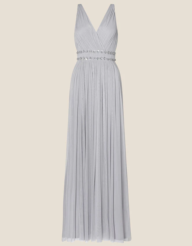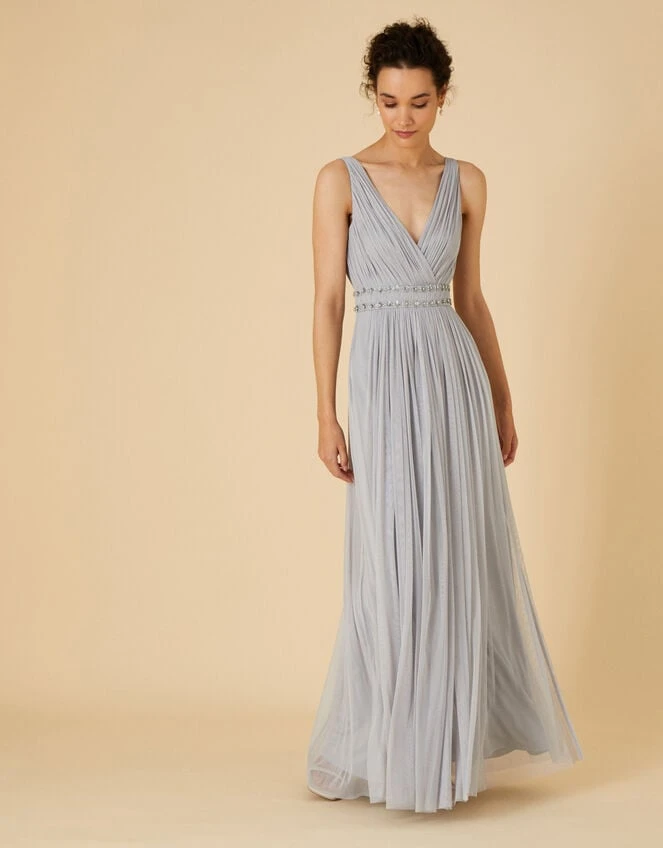 A pretty pleated finish and sequin embellishments are what makes this dress the perfect piece for those special occasions. Designed with dusky grey tulle, the wrap-style bodice boasts embellished straps and sits slim at the waist creating a cinched profile, whilst the skirt falls softly to maxi length.