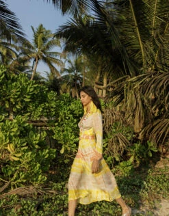 With a tie dye backdrop inspired by the vibrancy of Goan coast, this maxi-length kaftan is designed in our favourite wrap silhouette, tying with a wide tie-belt at the waist. The bohemian-style neckline is embroidered, with sequin embellishments that’ll reflect the incoming tide. Simply place it on over your swimwear with your sandals in hand for long sandy strolls.