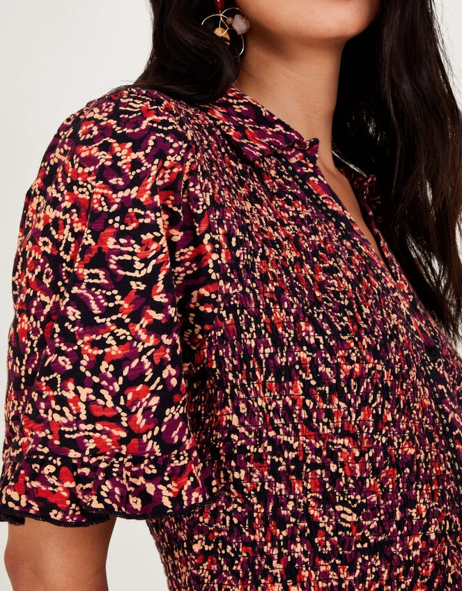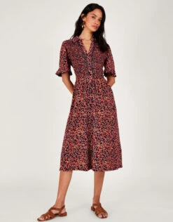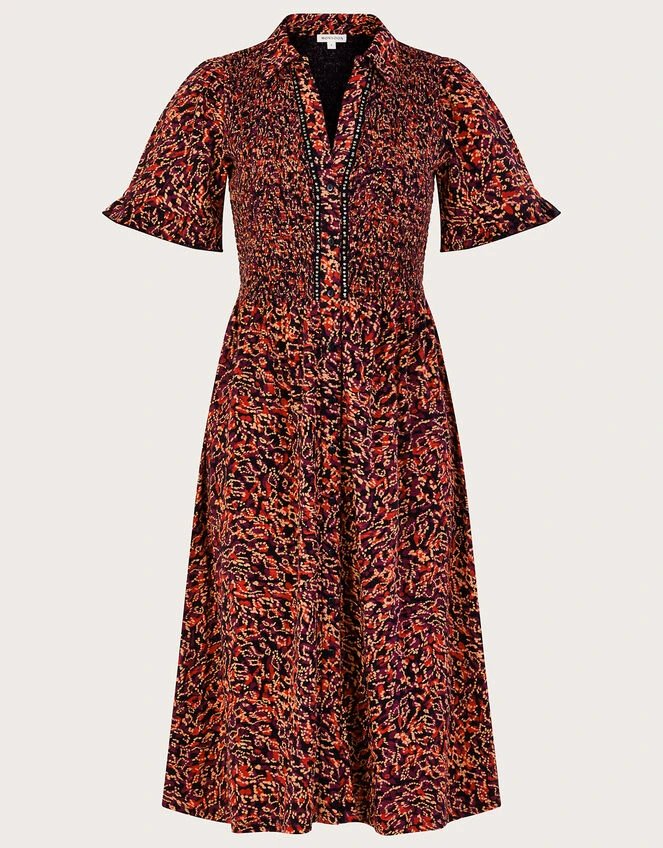 A fiery print races through this shirt dress, destined to create a blaze in your wardrobe. It features a button-through front that finds its way over the shirred bodice and collared neckline, with frill sleeves to finish. Spun in better-sourced cotton.