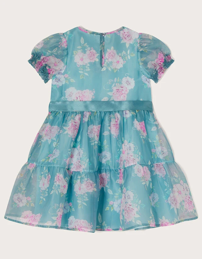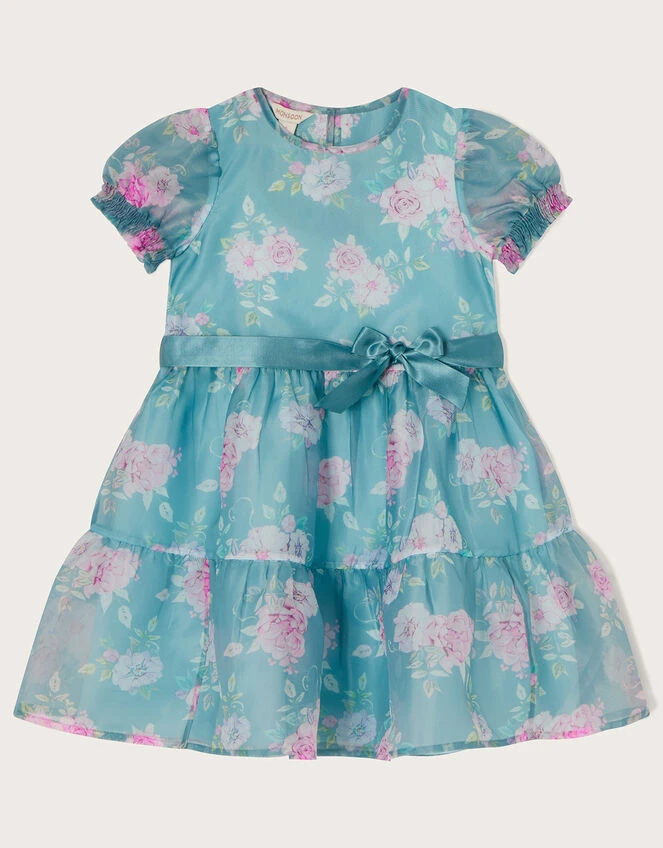 Regal roses decorate the organza overlay on this voluminous dress, a perfect option for birthday parties and special occasions. Fully lined, it’s complete with short puff sleeves and a glossy ribbon around the waist. Fastens on the back with a button.