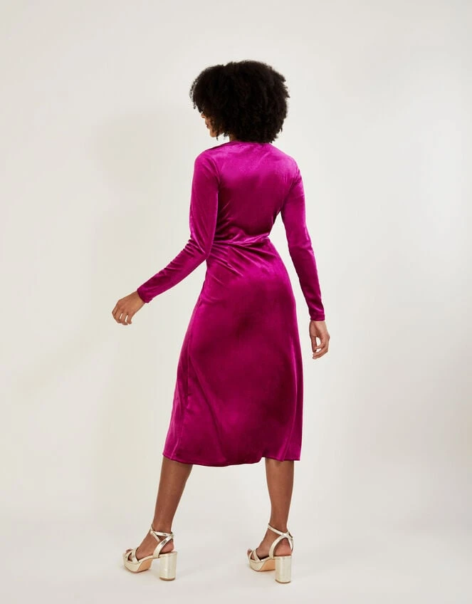 Boasting a classic and feminine square neckline, Rachel’s luxe velvet backdrop shines in a deep magenta hue. The midi-length skirt features a wrap-style slit, perfect for the end of year festivities.