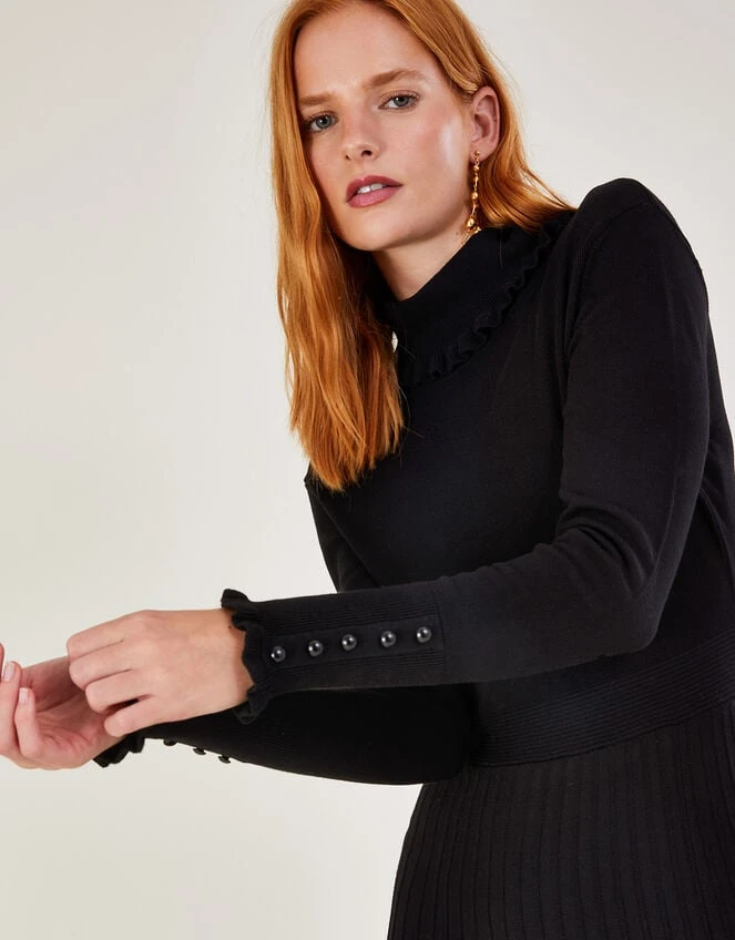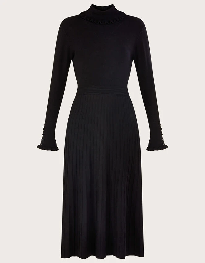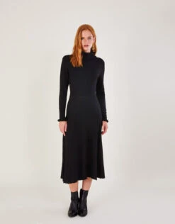 Keep it chic but stay warm this winter in this roll neck dress. It’s finished in a soft and subtle knit, with ruffle detailing to the cuffs and a ribbed skirt that’s just waiting to go for a spin round the office.