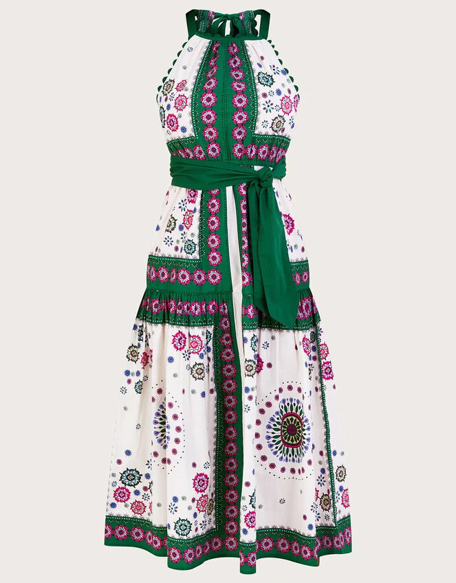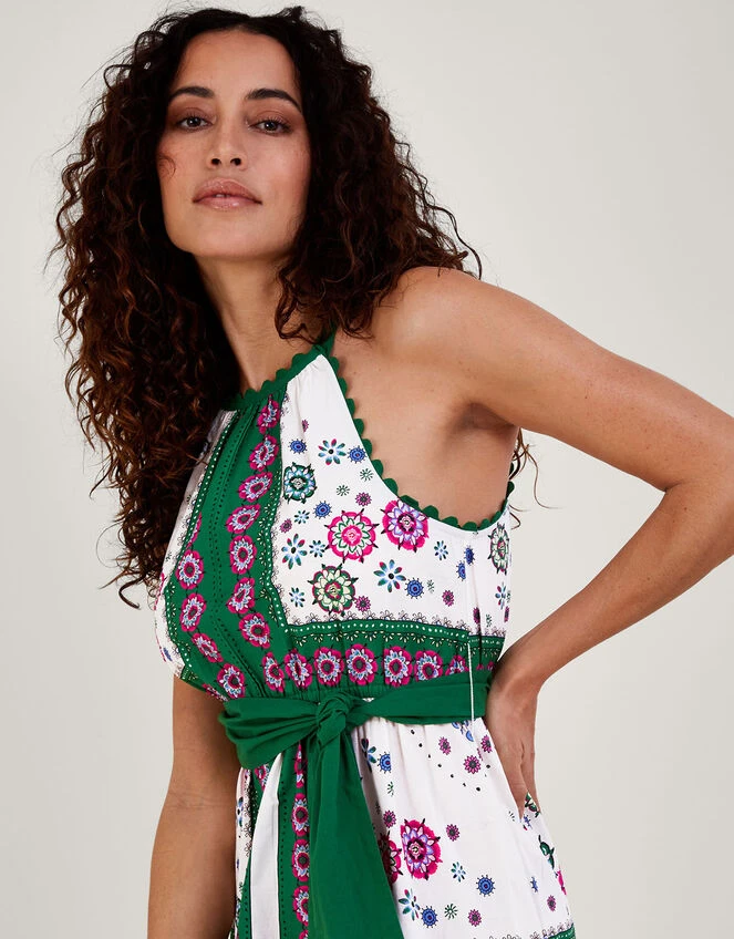 Seeing you through annual family holidays and warm summer garden parties, this midi dress will forever be a favourite. Through the bursting print, it combines forest green with fuchsia to create a complementary colour palette. And the silhouette? It features a halter neckline and tiered skirt, but it’s the wrap tie around the waist that makes the ultra flattering fit. Designed in cotton for an airy finish.