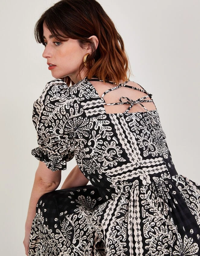 Stand out from the crowd with this wardrobe favourite. Decorated in elegant scarf print, this dress features slight ruffling to the sleeves and skirt, with pretty strap detailing to the back. Style it with your favourite chunky sandal for a casual evening look fit for a barbeque. Black