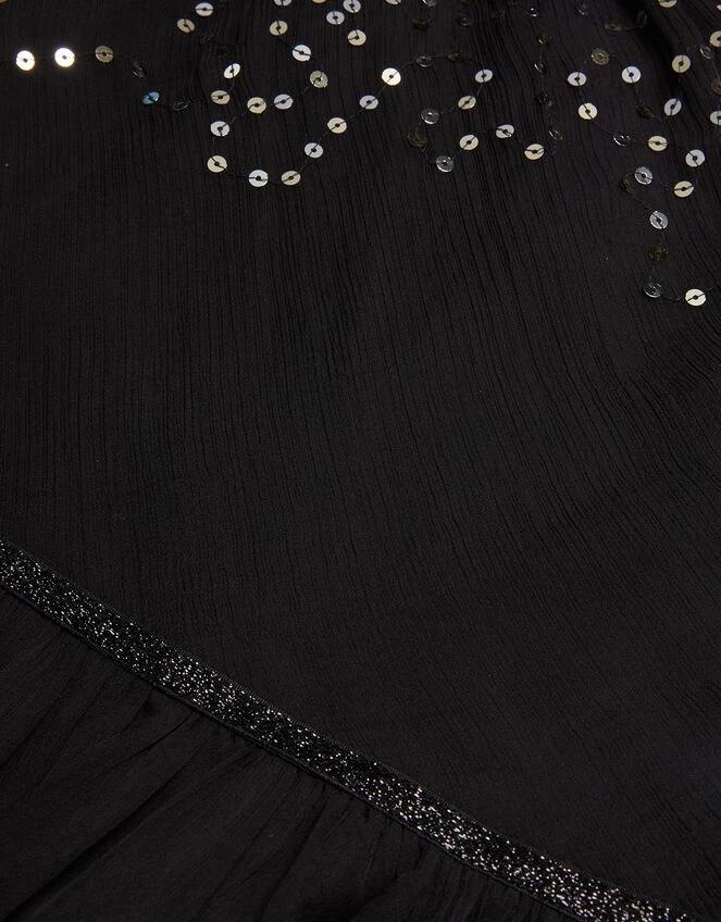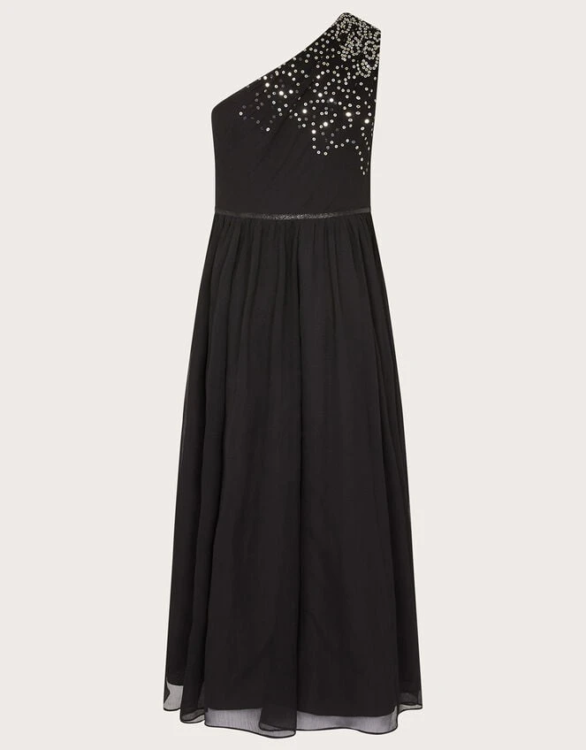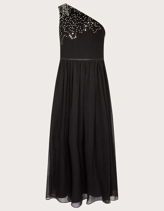 Take this one-shoulder wonder for a spin at their next big event. This dress features a scattering of sequins that fall from the one-shoulder neckline, transforming into a beautifully gauzy mesh maxi skirt.