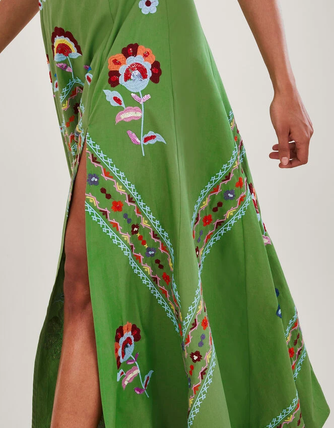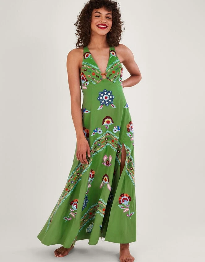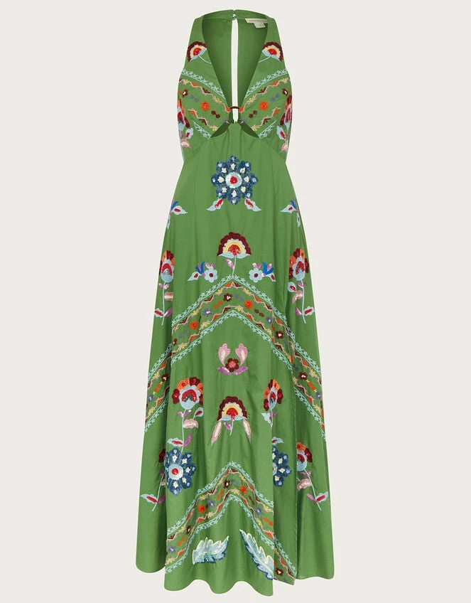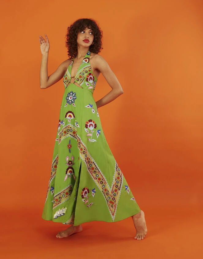 Eager to go for a spin at your next summer event, Shirley is full of detail that makes her a special warm weather piece. Her halter neckline is decorated with colourful floral embroidery that blossoms throughout the piece, with O-ring detailing to the centre for a swinging 60s touch. From the bodice, she falls into a maxi length skirt with a slit to the thigh for a breezy finish. Fastens on the reverse with a zip closure.