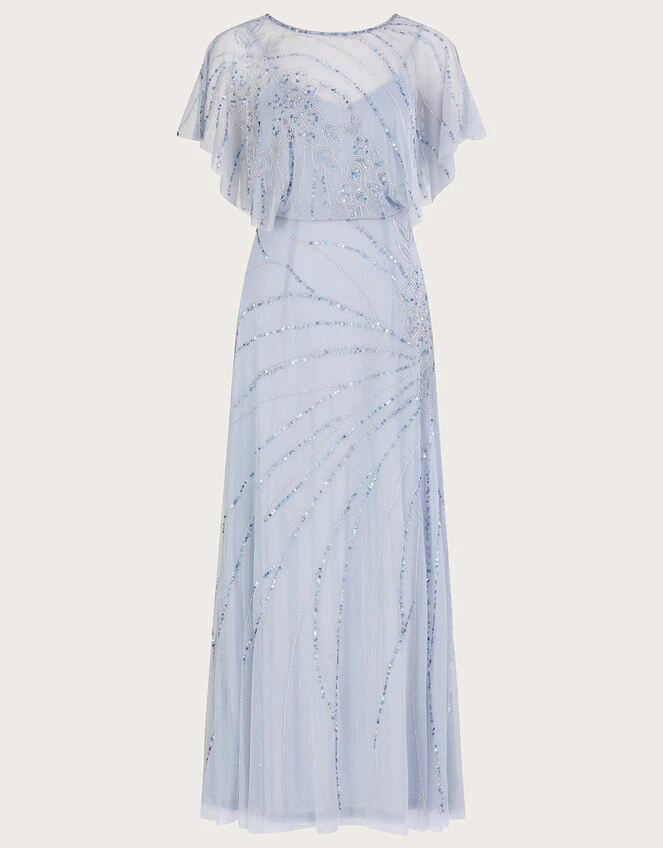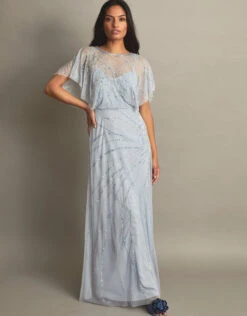 Ensure you’re feeling confident through special events in our Sienna gown, created in baby blue mesh that shimmers with embellishments. The draping, cape-style sleeves offer an angelic touch, whilst the fitted waist and flared skirt creates a flattering silhouette for all body types. Finished with a dipped back and zipper on the reverse, style alongside icy accessories for a complementary look.