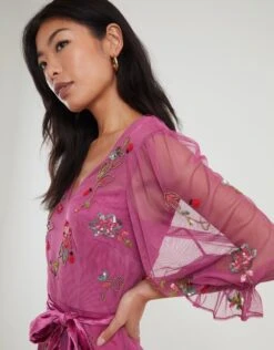 A mesmerising moment: Sienna combines an embellished, 90s-inspired, floral design with an elevated silhouette. Her bodice is airily layered, alongside tulle cape sleeves that connect at the back for a neat finish. The skirt falls to maxi length in a comfortably slim fit, with plenty of room to dance at the end of the night. Spun with recycled polyester, it fastens on the reverse with a concealed zipper.