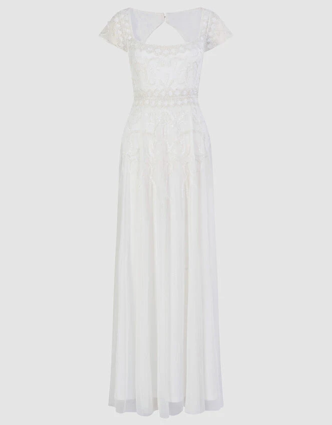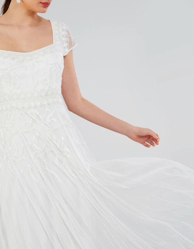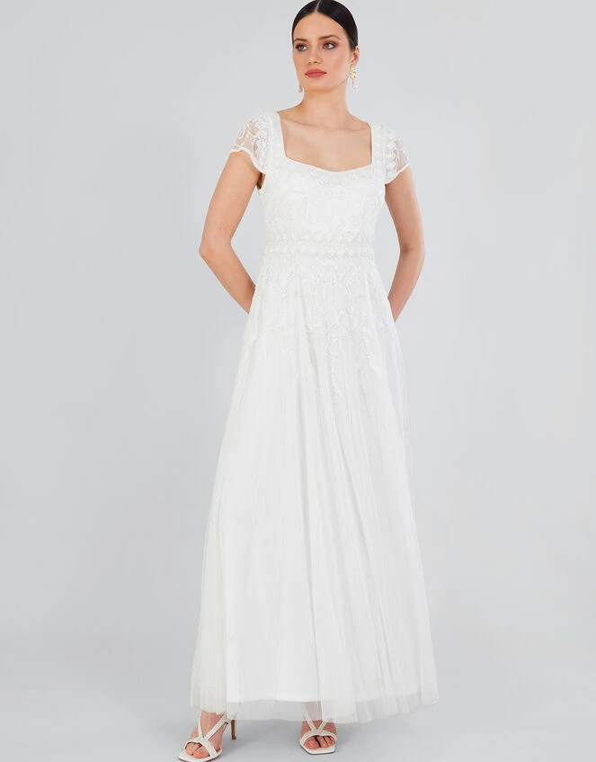 Introducing Simone, an ethereally beautiful option for the special day. Stealing glances as they take to the aisle, this dress is finished with a delicate floral lace overlay to the bodice, floating down the skirt in an evanescent manner. The a-line skirt features a tulle overlay that gently whispers to the ankles, showing off their bridal pedicure. Crafted for a summer wedding, the bodice is cut with a flattering square neckline and capped sleeves that transition into the cut-out detail at the back for a feminine finish.