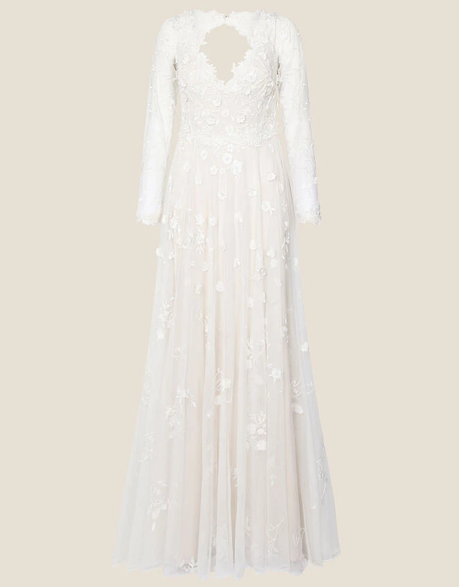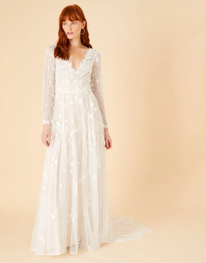 Sue’s powerful silhouette is built with a long sleeve bodice and a maxi skirt that falls to the floor. Finished with an open-back that adds an element of detail to the dress, just look closely to see the delicate florals cascade down the floaty mesh. Fastens on the reverse. Ivory