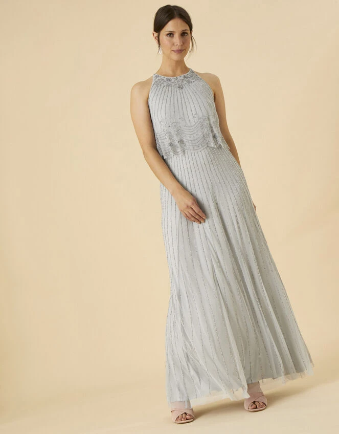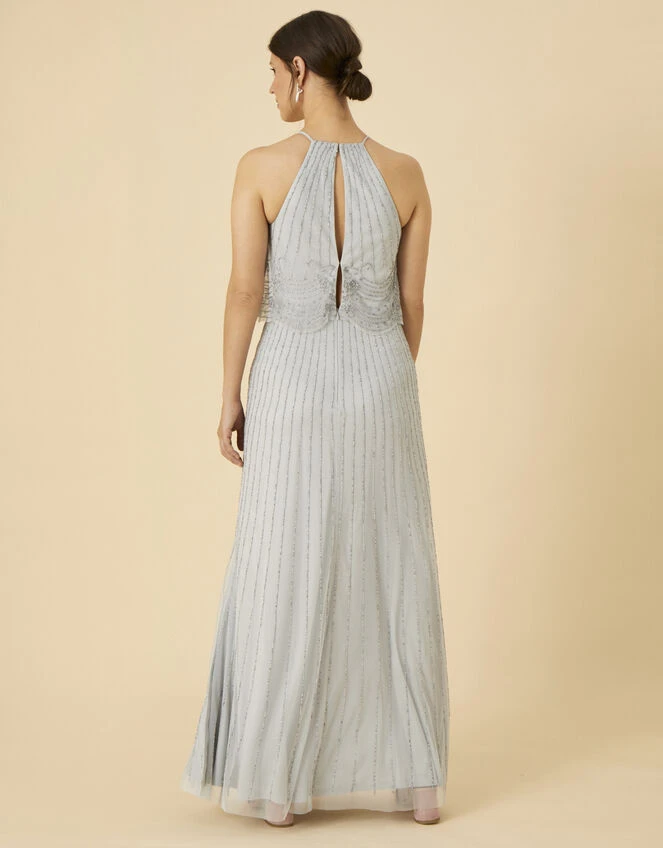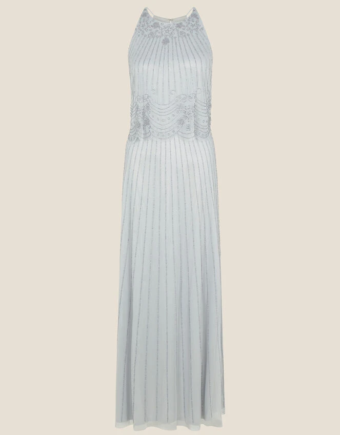 The intricate beading and airy mesh layers on our Suzanne dress makes her a suitable option for occasions. Her icy hue is carried throughout the dress, from the delicate halter neck, to the maxi-length skirt. Fastens on the back with a clasp and concealed zipper.