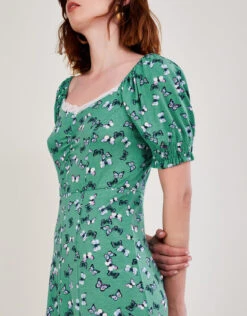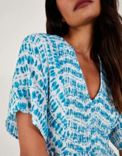 Designed with an all over tile print, this turquoise hue dress falls just above the knee. The shoulder straps tie at the top, with pleating to the bodice that falls into a relaxed. tiered skirt.
