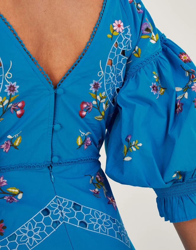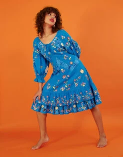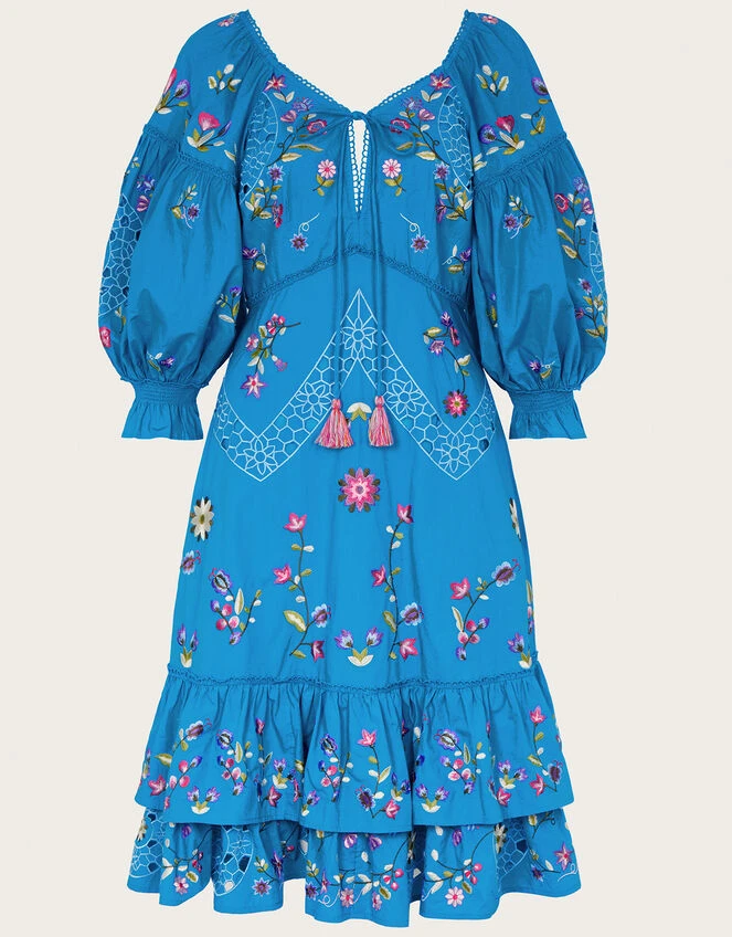 Bright and beautiful, this dress is head-to-toe embroidered and ready to party alfresco style. The floral embroidery runs through the piece, with geometric patterning through the skirt and bodice. The puff sleeves add a feminine flair, whilst the v-neckline fastening with tassel detailing that transcends into the tiered flared skirt.