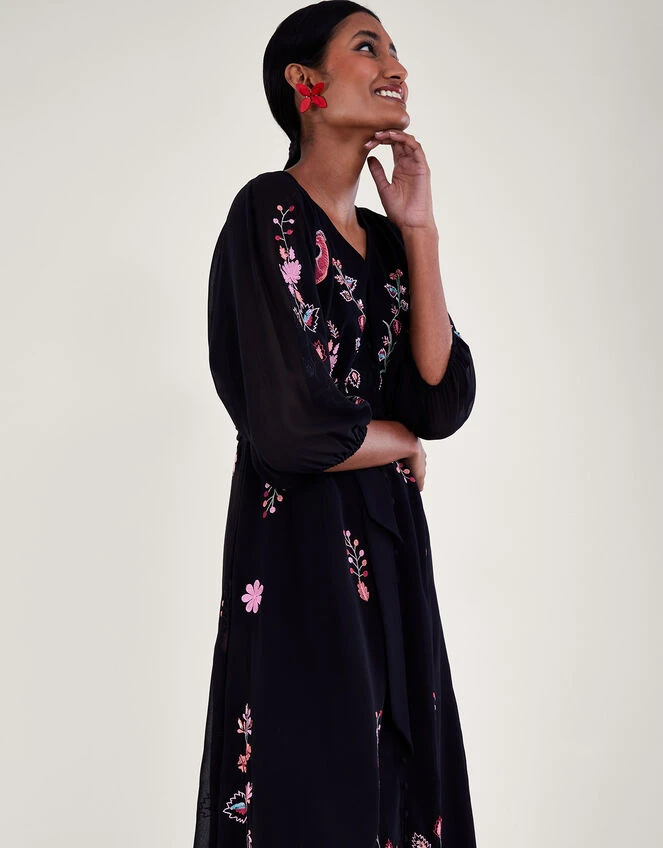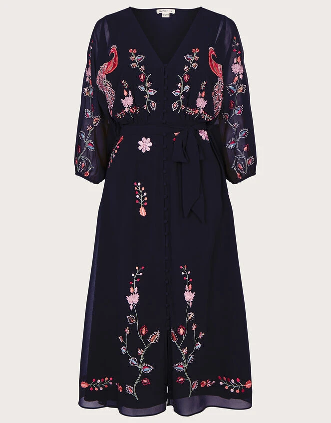 Focus on Tina’s vibrant embroidery and find the peacocks and florals throughout the dress. It’s cut in a classic tea dress silhouette, with blousal sleeves and a button through fastening. Style it with some serious strappy heels and become the perfect partygoer.