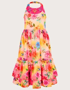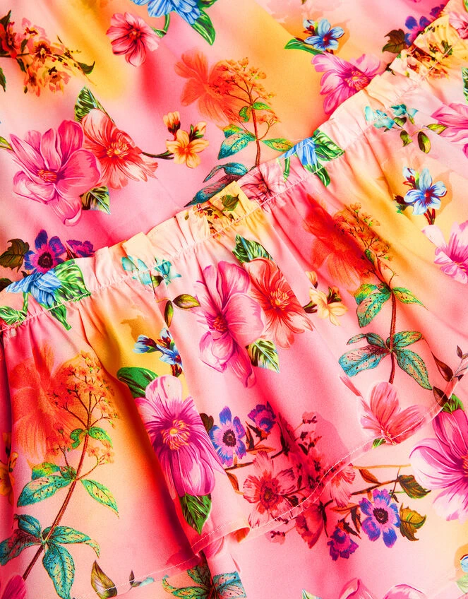 Dance through carnivals, fiestas and parties in this flamboyant piece. To the halter neck, find shiny gem embellishments before following the vibrant tropical print through the rest of the bodice and tiered skirt. Finished with a button fastening and stretchy shirred panel on the back for comfort.