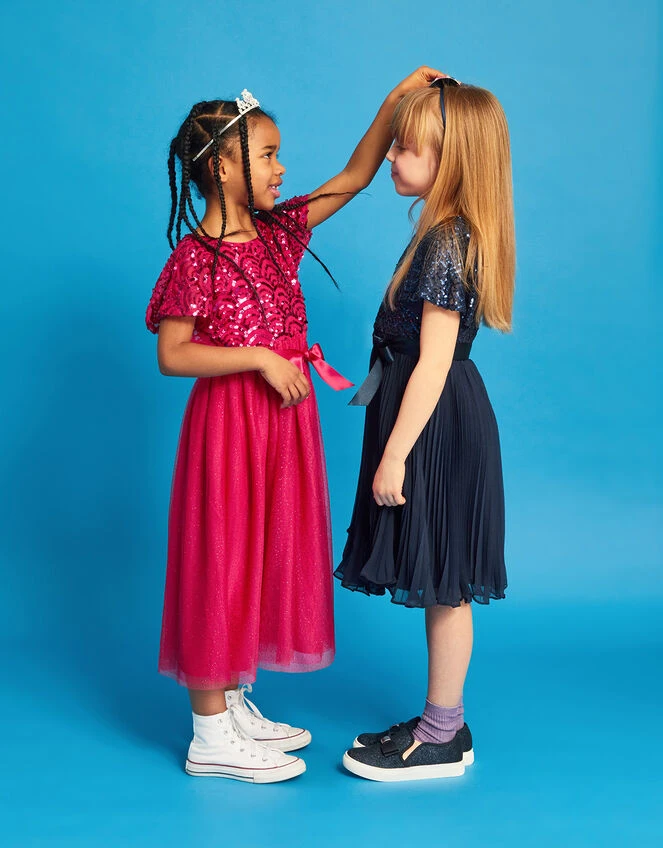 Our trusty Truth dress is back and better than ever, now with a sequin Art Deco bodice! They’re sure to feel like a princess, with a silhouette that’s built with cape sleeves and a floaty tulle skirt. The waist ties with a ribbon for a beautiful finish, and the back fastens with a concealed zip.
