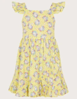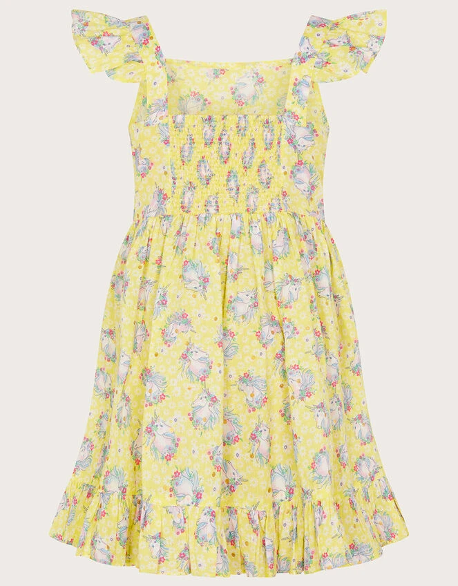 Only seen in their dreams, this dress showcases an enchanting print of unicorns and ditsy flowers over a lemon backdrop. The profile includes flutter sleeves and a square neck, before falling into a wrap-style skirt that’s complete with a frill hem. Crafted in better-sourced cotton.