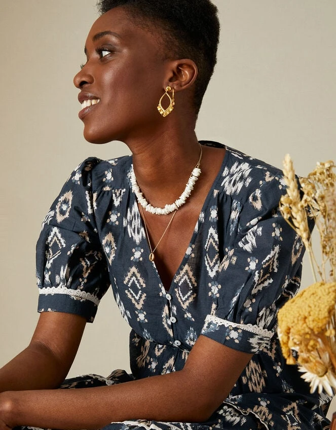 Full of detail, this dress is a real treat for the eyes. It features a bohemian-style ikat print on a classic tea dress silhouette that boasts subtle lace detailing to the tiered skirt and cuffed sleeves. Just slip on your buckle strap sandals and head out onto the high street.