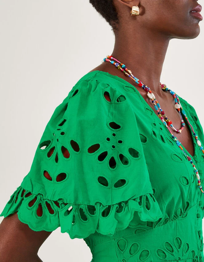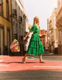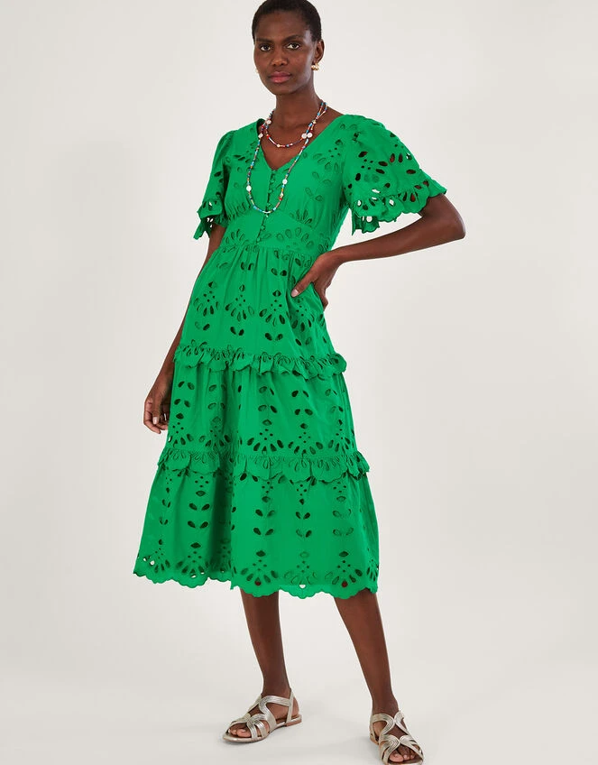 Friday fiestas and Saturday soirees call for frills, tiers and striking colours. Immersed in a true green hue, follow the broderie stitching through the floaty short sleeves and into the slim-fitting bodice of this dress, with defining seams that highlight the bust and waistline. Finished with buttons below the neckline, the frilly accents on the skirt add a playful touch to the profile.