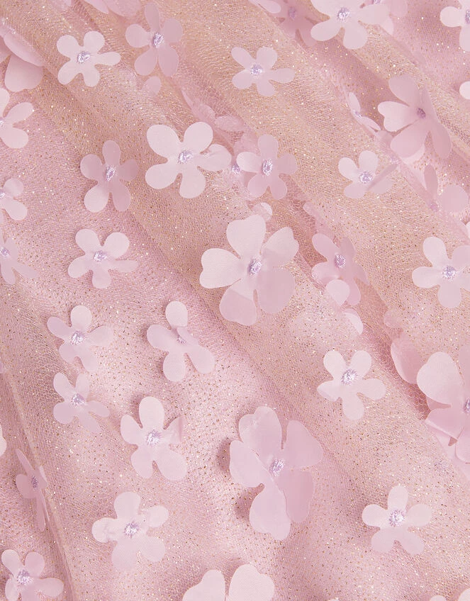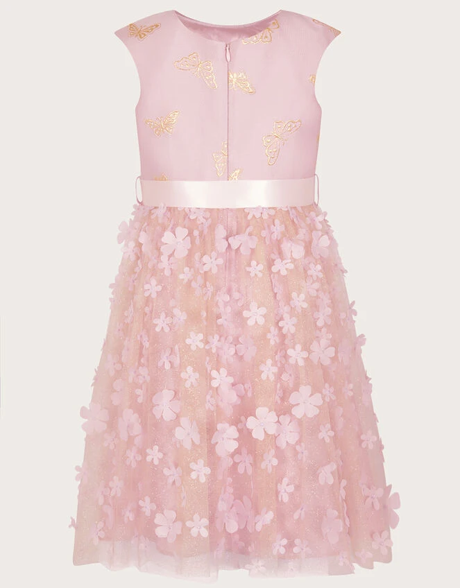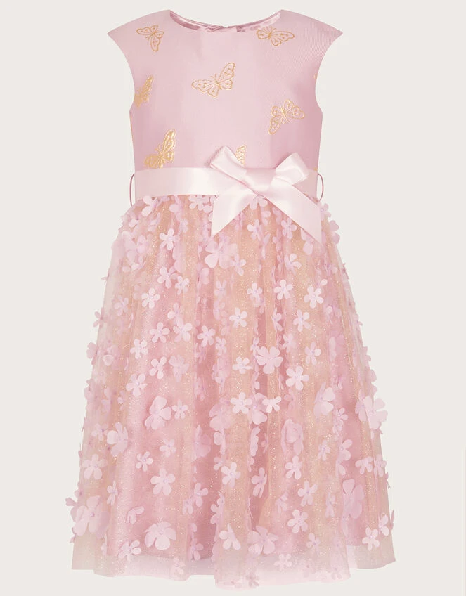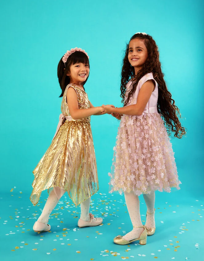 Full of glittering golds, Vanda is the perfect party dress. The bodice features a kaleidoscope of butterflies in flight, transitioning into a mesh overlay skirt with 3D flowers and sparkling glitter. Style it with their twinkliest party shoes for a complete look. Pink