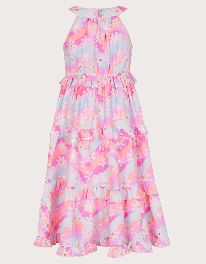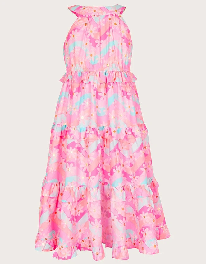 Combining a pink palette with a 70s wavy floral print, this dress is destined to be a wardrobe winner. It features a halter neck bodice with a foil print and frills that define each tier of the maxi length skirt. Fastening with a keyhole button on the reverse, layer one of our cropped children’s cardigans over the top for when the afternoon breeze seeps in.