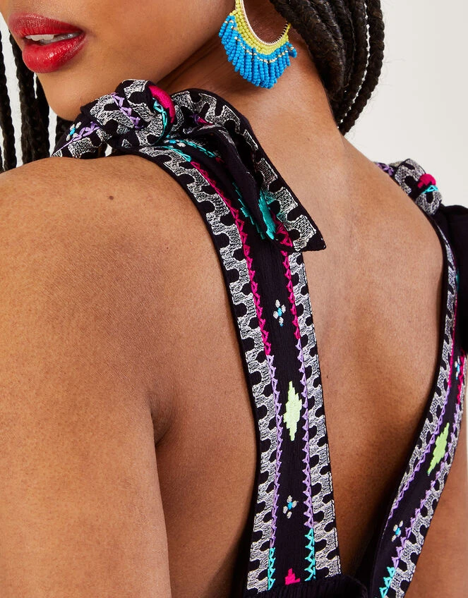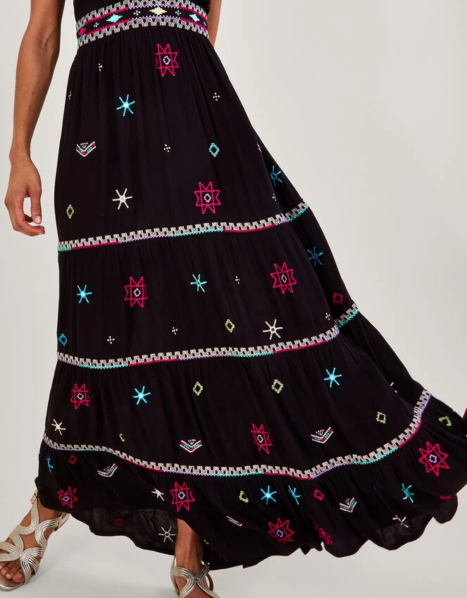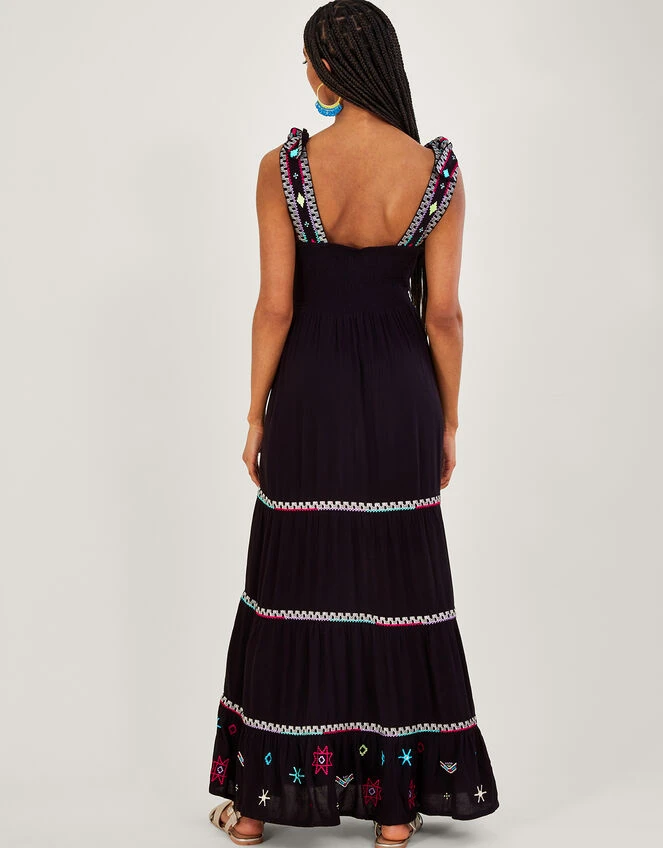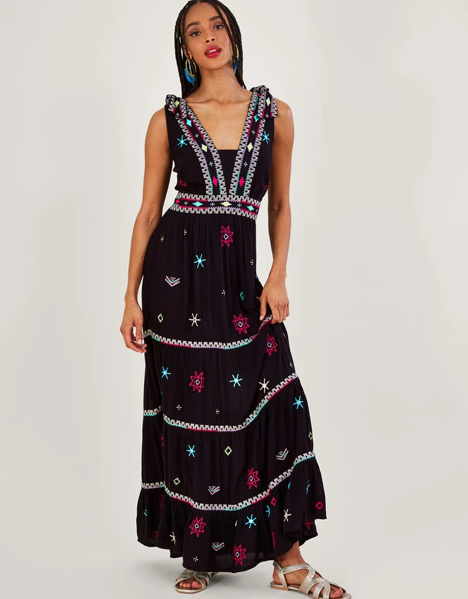 A constellation of motifs decorate this dress, creating a piece that’s artfully bohemian. Follow the embroidery through the v-neck bodice and maxi skirt, with taping that defines the waist and tiered profile. Finished with wide tie straps for comfort, slip on your comfiest sandals to complete the look.