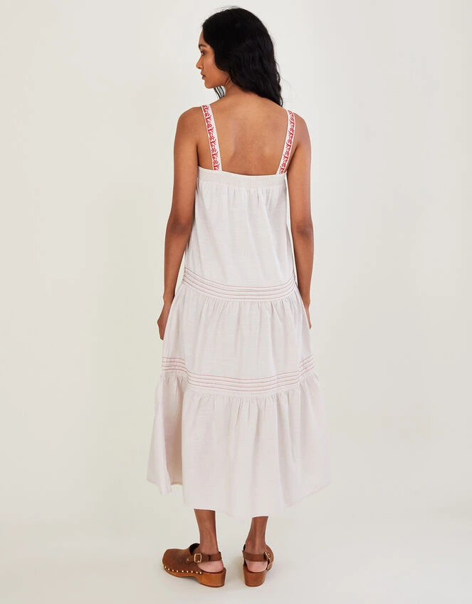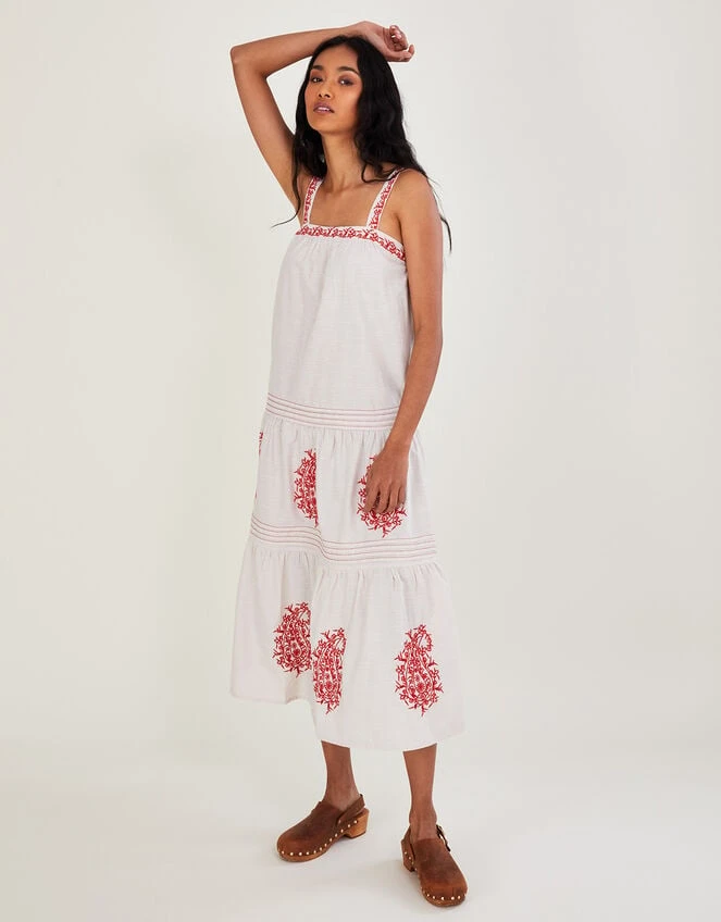 Summer strolls are kept breezy in this tiered number, falling into a relaxed fit for comfort. Paisley embroidery decorates the neckline, straps and layers of tiers, adding an element of detail to the dress. Spun in breathable, sustainable cotton.