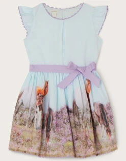 Wild horses run free on this dress, the perfect party piece for your budding equestrian. The capped sleeves and neckline boast a lilac scallop trim, with a matching bow to the waist.