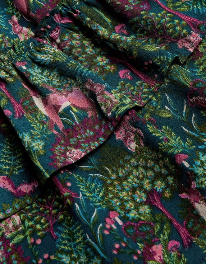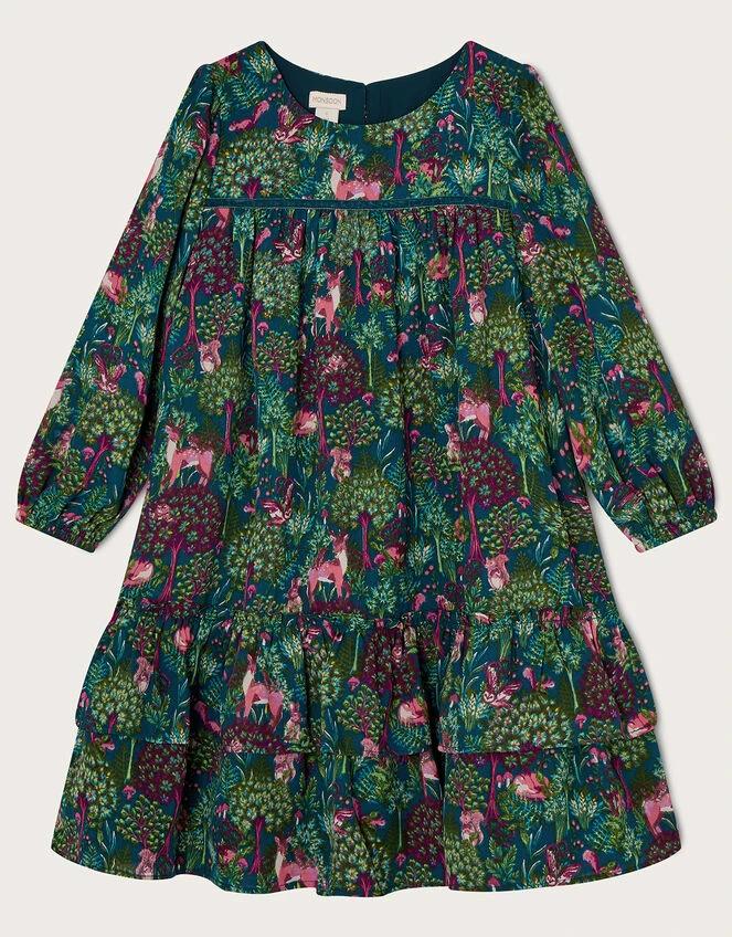 Woodland or wonderland? This long sleeve dress presents a charming scene of bunnies, deer and squirrels amongst deep forestry. Style the tiered silhouette with long boots and tights to take it out to a family dinner. Fastens with a keyhole button on the back.