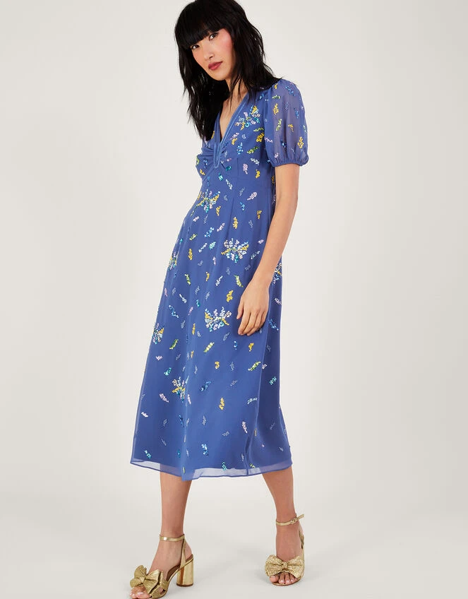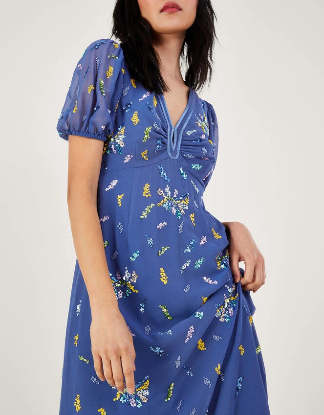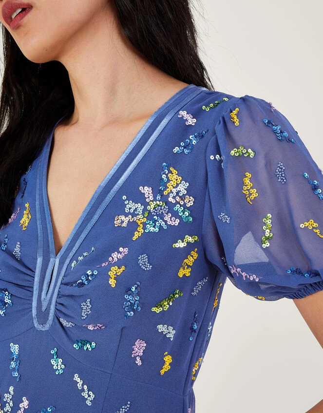 Dare to sparkle in our Zena dress, designed in cornflower blue fabric with a whimsical mesh overlay. We’ve put an elevated spin on its classic tea silhouette, with puff sleeves and a cut-out detail to the back, whilst a band sits around the empire line for added definition. Watch the sequin embellishments twinkle as you make your way round the gathering.