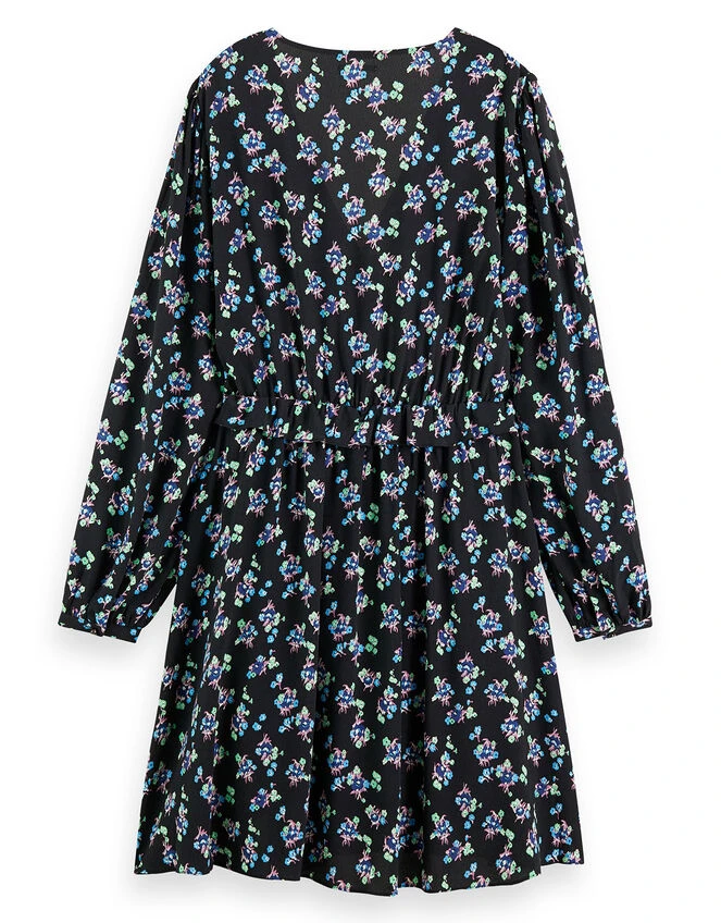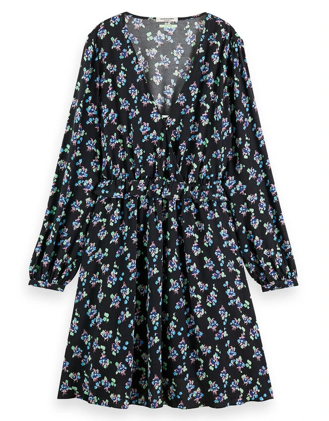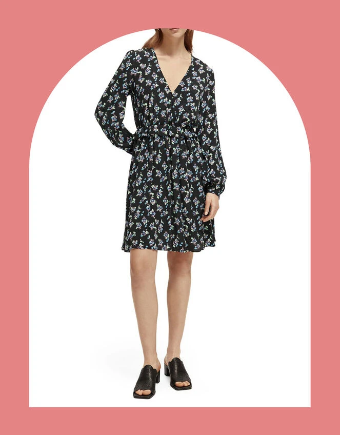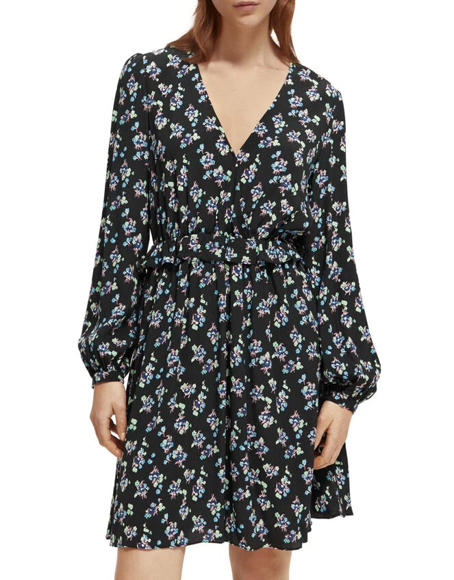Blooming over the entire piece, this dress showcases a ditsy floral print that stands out amongst the black backdrop. Its profile combines comfort with a flattering fit, built with blouson sleeves and an elasticated waist that enhances your natural waist. Finished with a v-neck, layer up your favourite necklaces when styling it in the evening.