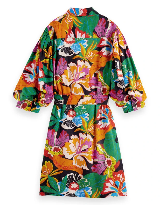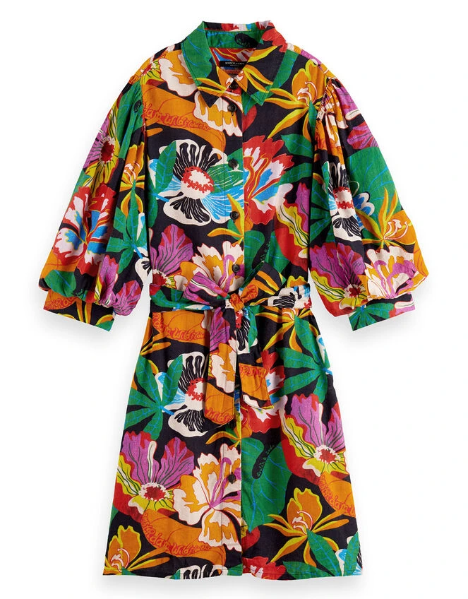 In full bloom, style this botanical print dress through the streets of your local holiday destination – taking you from dusk ’til dawn. Built with puff 3/4 length sleeves, it features a button through front that’s topped with a collared neckline. Cinch in the waist with the corresponding belt or keep it loose for an airy fit.