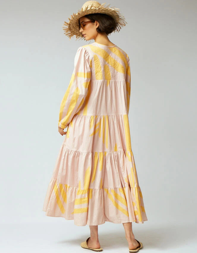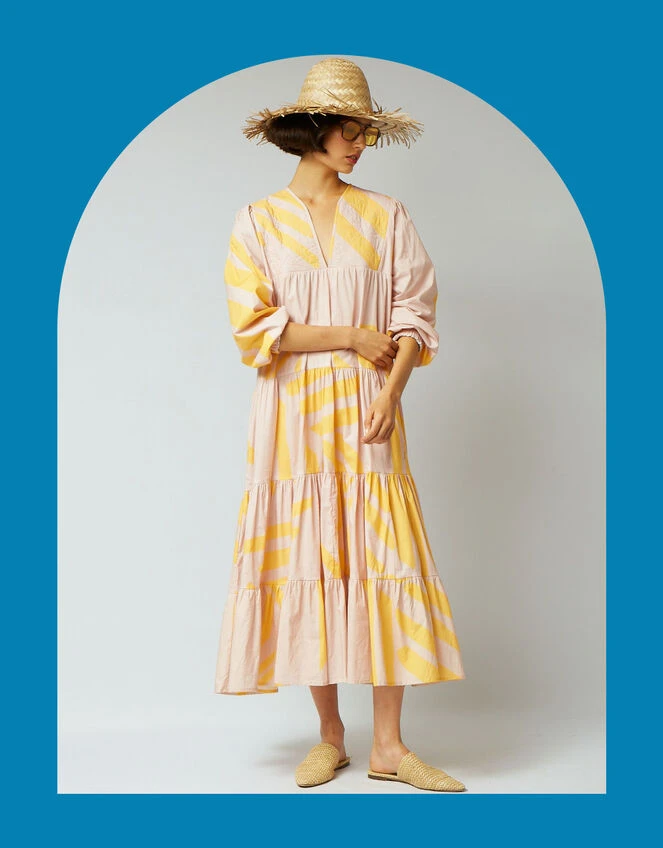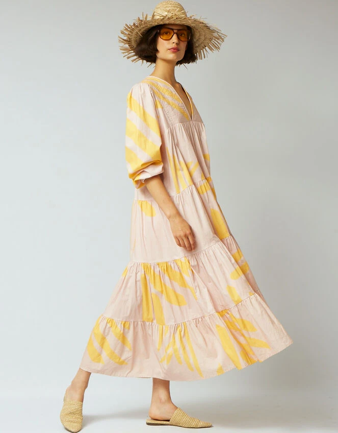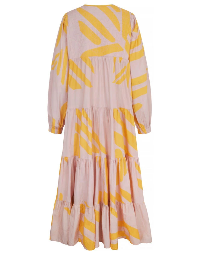 Feel the gentle sea breeze in the India dress, built in a tiered maxi profile for optimum airiness. The chest, shoulders and back panel is finished with subtle quilting, whilst the rest of the length features soft ruching from the tiers. Finished with a v-neck and long cuffed sleeves.